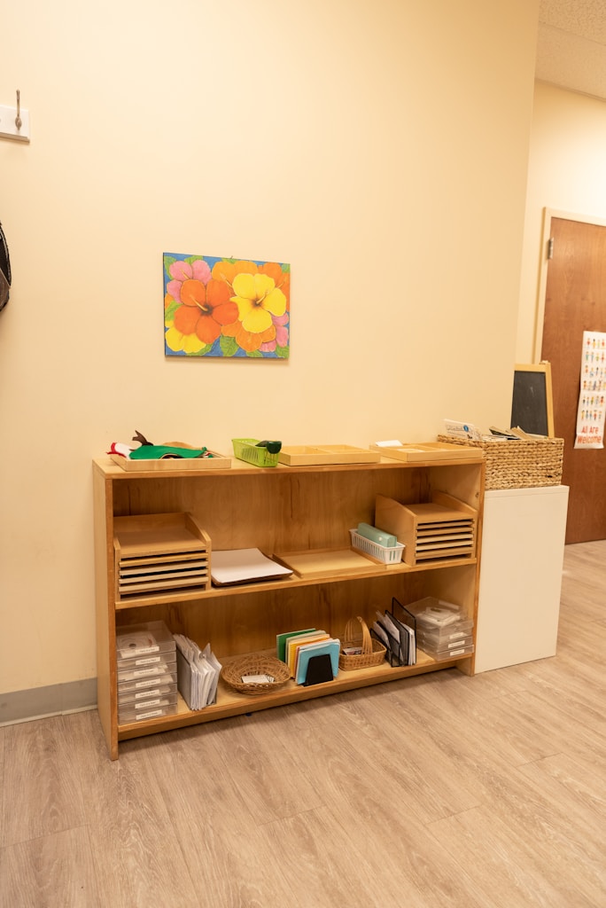 A colorful classroom with small tables and chairs, bright decorations, and educational materials. Children's artwork is displayed on the walls, and there are playful elements like painted benches and a vibrant alphabet rug.